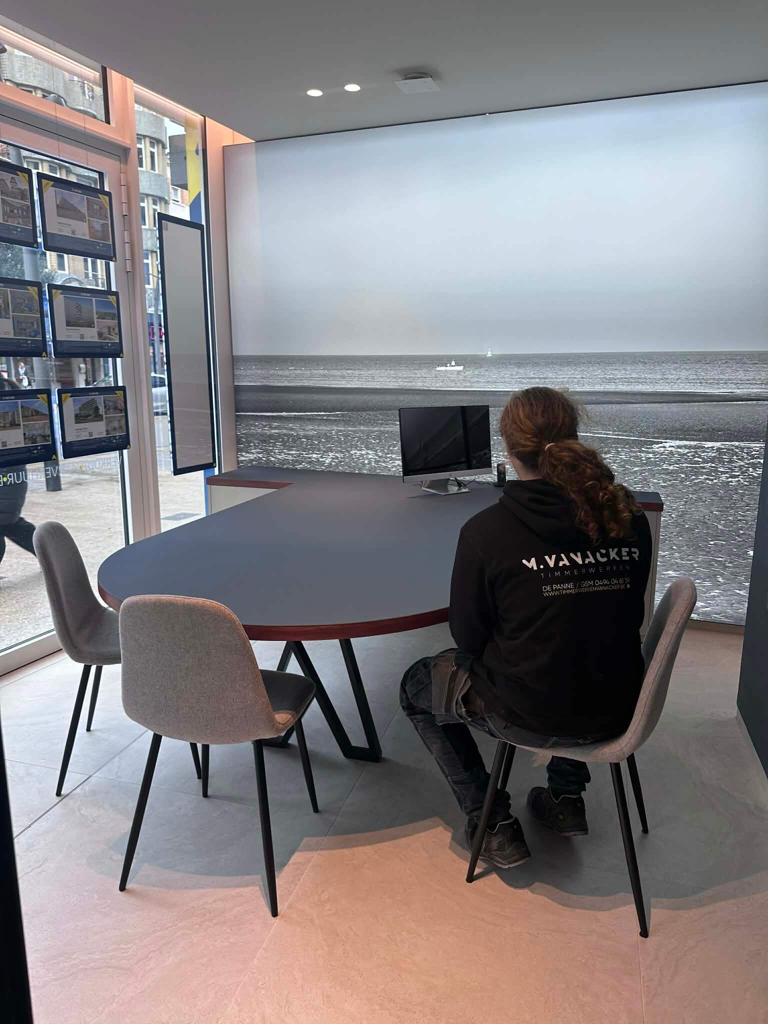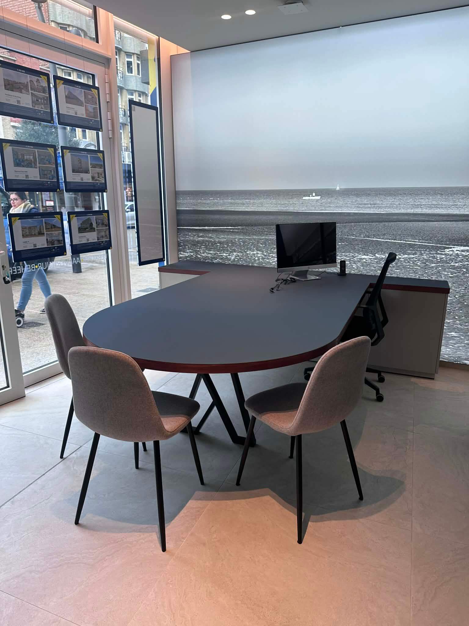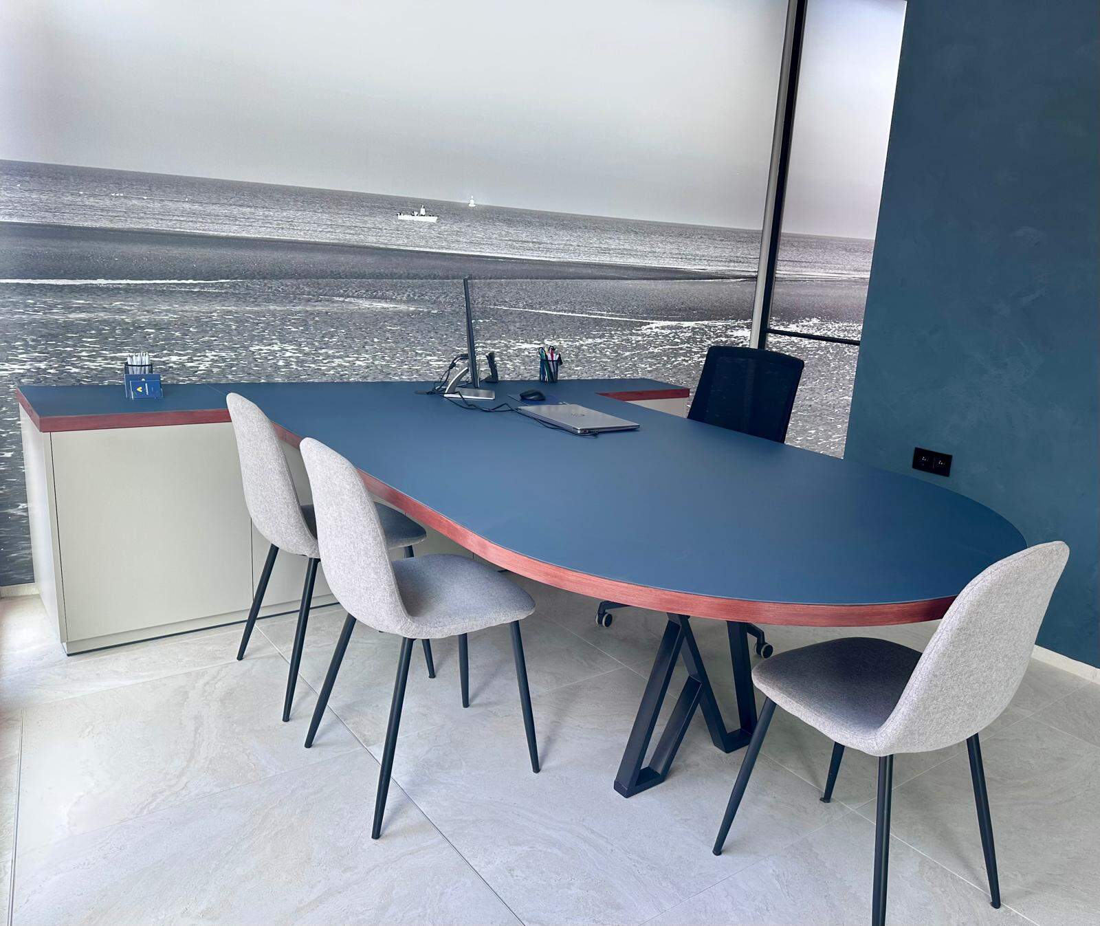 We maakten een bureau meubel die werd afgewerkt met een Smokey Bleu Forbo linoleum toplaag: duurzaam, stijlvol en comfortabel in dagelijks gebruik.